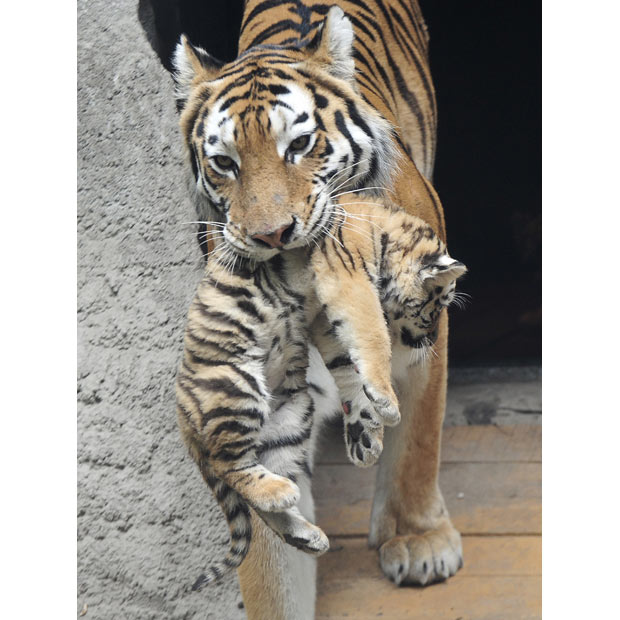 tiger mother Niva carries one of her cubs at the Budapest Zoo and
